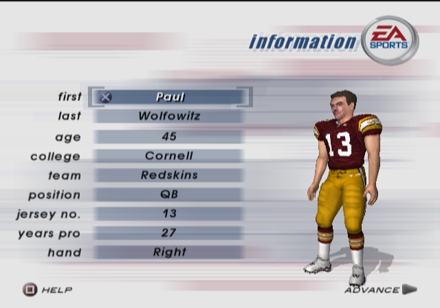 More than ever, Madden 2003 was a pure power fantasy for the typical American football fan. It allowed players to exert control over the sport that they love, filling the void left by the control they no longer believed they had over their own lives. The standard customization options from 2002 remain intact, with create-a-player and create-a-team modes giving football fans the ability to reinterpret the fabric of the league, and build a new universe free from the cold, harsh truths of reality forced upon them by the actions of terrorist and governmental actor alike.