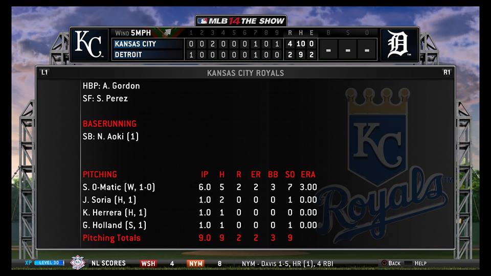 Indeed, Pat Burrell’s plate discipline was as great as ever. He took two walks in the game, scoring one of two more runs the Royals tacked on to support Strike-O-Matic’s strong outing. The pitching machine left in the seventh inning with a 3-1 lead, replaced by the Royal’s newest re-acquisition Joakim Soria. Soria allowed two hits and an inherited runner to score, but that’s all the Tigers would get from the Royals’ bullpen. Despite everything Ned Yost tried, the Royals won their first game in convincing enough fashion.
