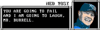 Pat Burrell suggested that Strike-O-Matic might be held back to game three, the Royals home opener against the Chicago White Sox and avoid the dangerous Cabrera. Unfortunately, he’d only supplanted the Kansas City GM and not the manager. Ned Yost thought that the big new signing who could throw 102 MPH should get the opening day start. Yost further hoped to undermine the new player/general manager Burrell by placing him straight into cleanup slot despite the fact he had not face Major League pitching in years.