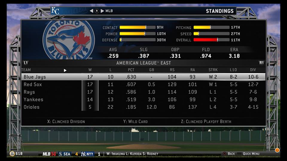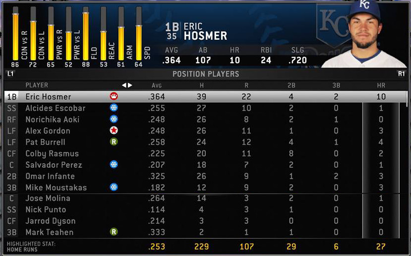 The incredible performance of Eric Hosmer, the simpleton who said nothing but his own name and hit nothing but baseballs, was the biggest standout. He hit just one fewer home run in April than the entire team of the 2014 Prime Kansas City Royals. His numbers put him on top of the hitting leaderboards in both HR and OPS, while in this universe the Yankee’s Michael Pineda avoided both arm injury and pine tar controversy to top the American League in ERA.