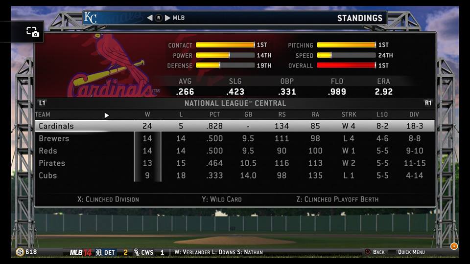 In the National League Central, the St. Louis Cardinals were absolutely dominant. This had nothing to do with the team preference expressed by me, the chronicler of this First Base War, but rather the addition one more excellent starting pitcher to an already dominant staff. Yes, unlike the AL Robot Masters, PrimeTime Moose had taken quite well to the baseball of 2014. He led the National League with a .094 ERA and a 6-0 record. He allowed only a .142 average against RH hitters, and paired up alongside ace Adam Wainwright and an emergent Carlos Martinez (2.60 ERA). The only Cardinals hitter of note was Matt Holliday, who had a 1.039 OPS throughout the month, but with those pitchers…who needs hitters?