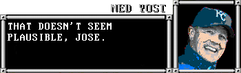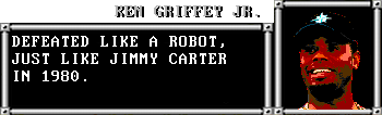Thanks to all the pitches thrown in the process of walking seven batters, Strike-O-Matic had to come out of the game after he struck out Ken Griffey Jr. He was replaced by the Royals bullpen, which had been just as inconsistent as the rest of the team. The seventh inning went smoothly, but then came the eighth, where one bad play and one phenomenal one would define the rest of the game.