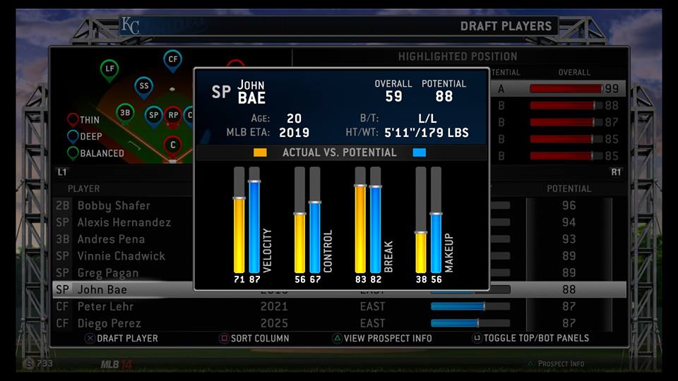 Other than the guy named Bae, Burrell focused primarily on possible replacements for departing position players–himself and Infante. This would normally be a terrible strategy for the MLB draft, but in the brave new world created in alt-2014, projecting prospects was a lot more reliable and the particular players chosen were both already fairly close to the major leagues.