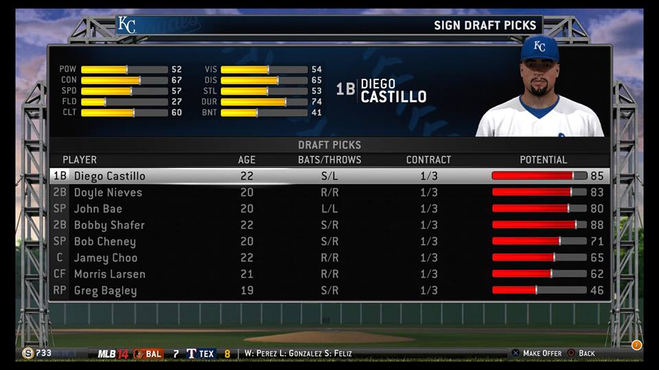 But before the Royals could deal with Flash Money and the New York Yankees, they had to deal with the draft. Even though player/GM Pat Burrell was entirely focused on winning in the 2014 season, he knew that he couldn’t just punt the draft. No matter what happened in 2014, there was no going back to the future and Strike-O-Matic would have to be a Royal for at least a few more years.