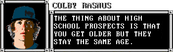 Diego Castillo was the most polished player available to the Royals, and his 52 power was the highest spotted by Kansas City scouting. Of the two 2bs drafted in the supplemental and third rounds, respectively, Nieves was the most likely to actually stick in the middle infield, but Shafer had the better bat. Bob Cheney, like John Bae, was drafted for his name. The rest were somewhat randomly picked when Pat Burrell got bored.