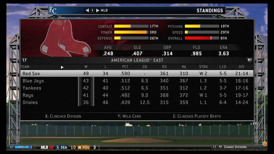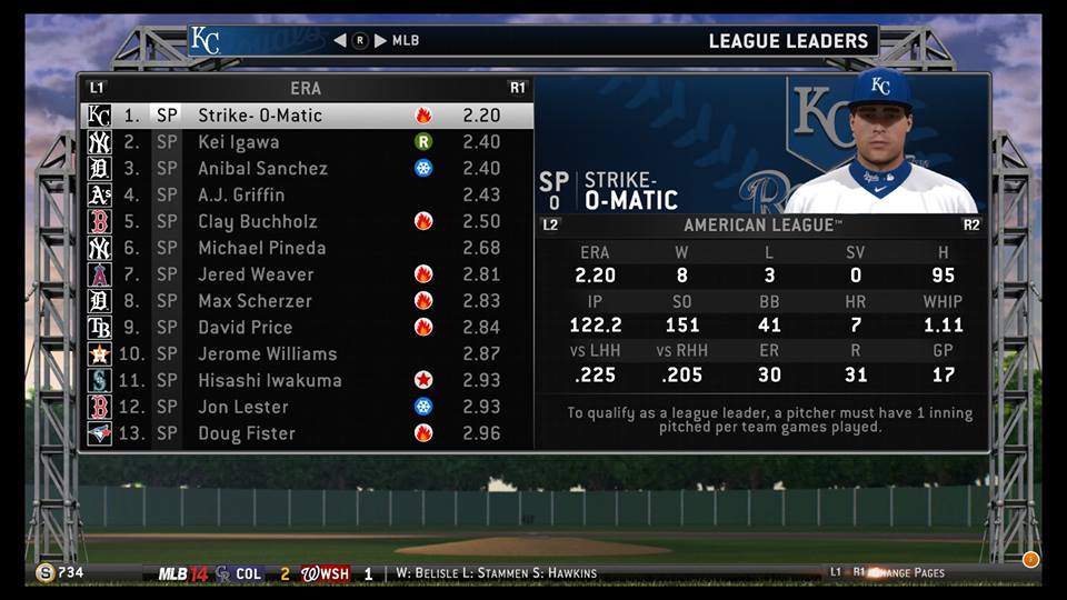 On the other side of the baseball, the American League pitching leaderboard was half complete insanity, with Kei Igawa, Anibal Sanchez, and AJ Griffin vying for the second spot among ERA leaders behind Strike-O-Matic, and Jerome Williams’ name appearing on it at all. Disheartening to the Royals was the absence of robot master Stubby Candyman from the list, as he had absolutely dominated them in two games, and it seemed as if the rest of the league wasn’t having the same difficulty with his vast array of breaking balls.