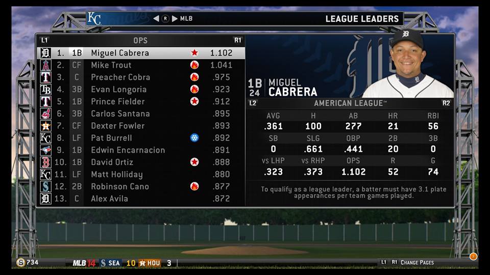 In the American League, the usual suspects Miguel Cabrera and Mike Trout held off an insurgent robot master, Preacher Cobra, in the AL OPS race. Cobra had struggled for the first two months of the season, but turned into a monster during June, hitting almost .500 for the month. For the KC Royals, Pat Burrell and Matt Holliday held down decent spots on the leaderboard.
