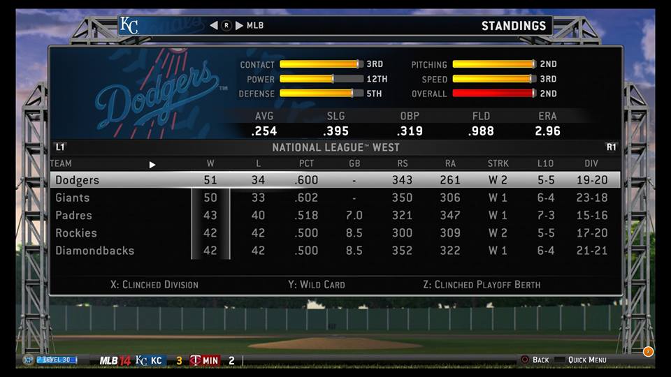The NL West continued to be a two team race between the same two teams that dominated the division in 2014-prime, the Dodgers and the Giants. Still, none of the other teams in the West were actively bad. Even the Diamondbacks, the welcome mat of 2014-prime, were working with a .500 record with the help of Robot Master Dubya Bush.