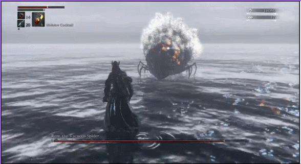 I killed four bosses yesterday. The first was a giant, shambling pile of corpses. It had given me fits late Saturday night, obliterating me in one with a flash of red light that was only telegraphed if the game camera was pointed in the right direction. Its name was The One Reborn. I had to grind out a few levels of vitality to be able to withstand the red flash. Once I could do that, he went down in one try.