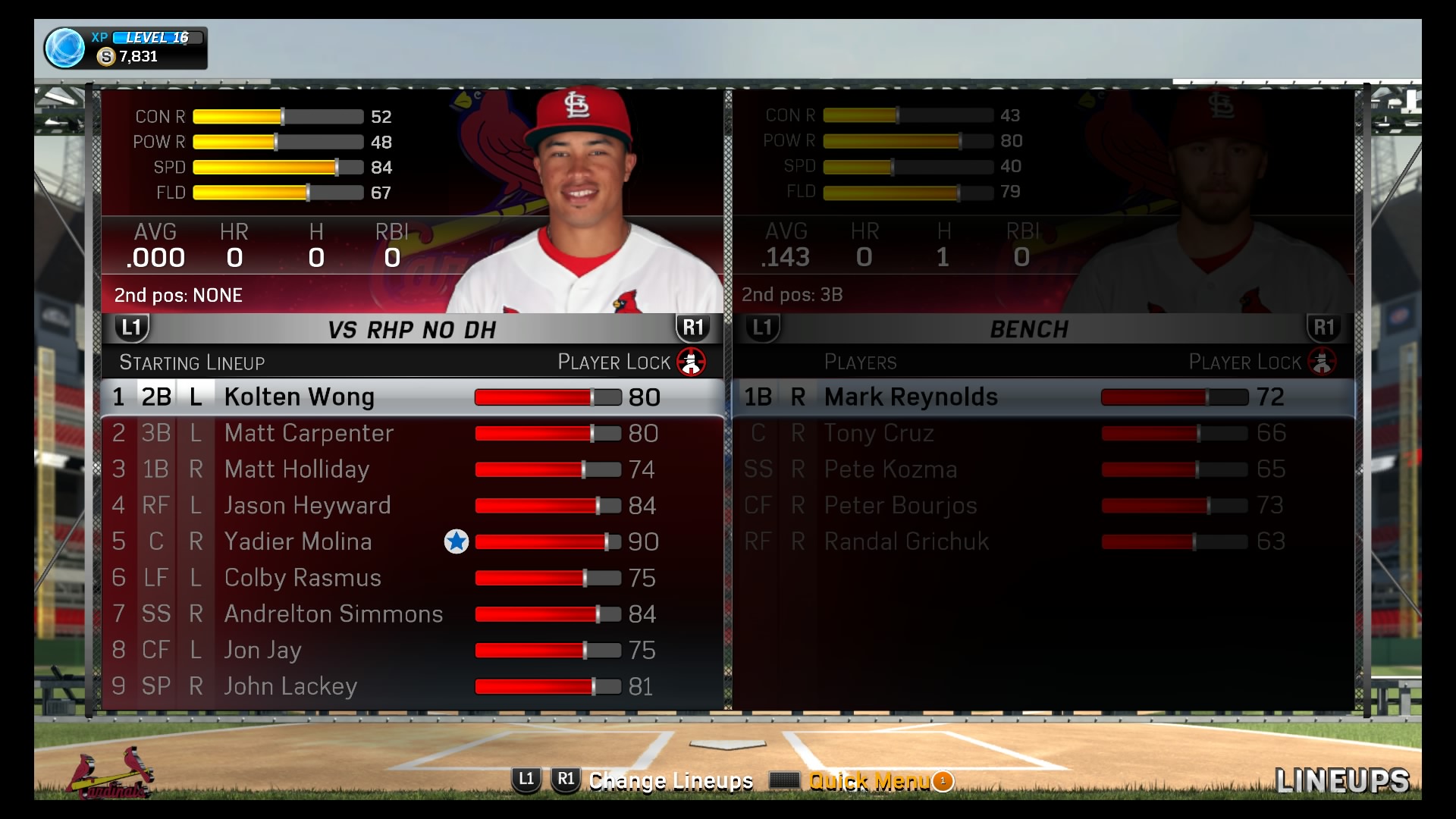 There’s only one problem with this: The Show is weird about players out of position. If you recall a few weeks ago, when I subjected Lance Lynn to the terrifying gauntlet of a team entirely out of position, there is a penalty to such alignments. However, maintaining those alignments requires a guiding hand. The AI manager will immediately re-align the defense to something far more conventional as soon as you give up control of the game. If I had given control of the Cardinals for even an inning, the AI manager would have tried to repair the line-up as best it could.