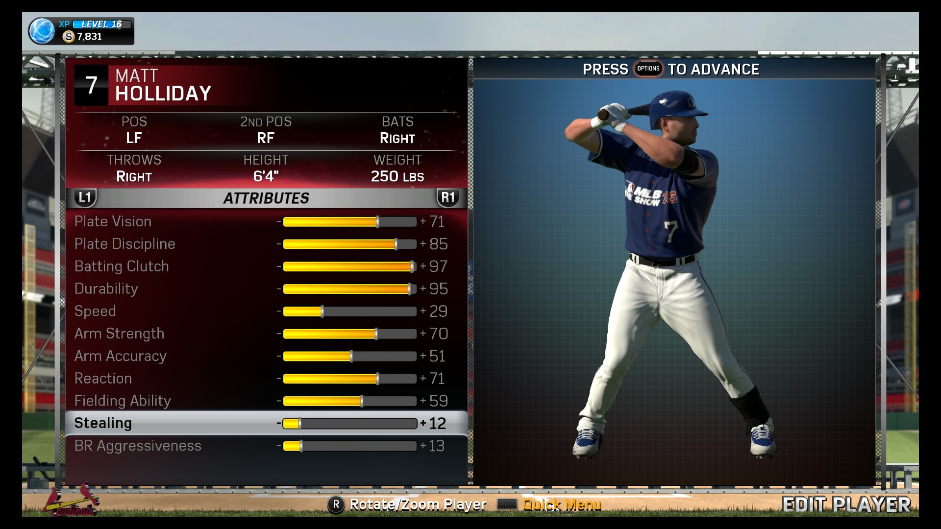 Now I had my general ratings. I half-assedly translated them to MLB: The Show, also knocking down Holliday’s durability to account for the fact that we were asking a man with a bad back to move to a position that requires much more bending and stretching.