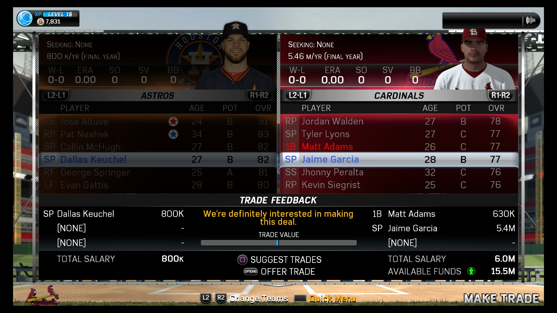 To set up my experiment, there were still a few more things to do. Matt Adams was no longer necessary, so he could be moved for a player who could add to the stakes of moving Holliday to first. Specifically, Dallas Keuchel, who led MLB in groundball % last season.
