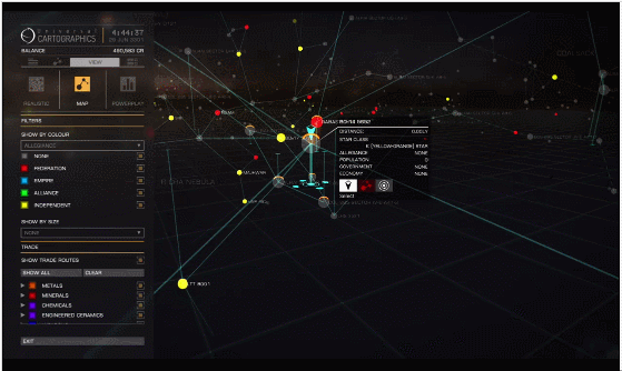 There’s more content in the game then the playerbase, as a whole, will see in their entire lifetime. Unfortunately, all this content is very same-y, boiling down to a few different activities you can do in slightly different ways. You can run shipping routes, which turns the game into Euro Truck Simulator 20xx: Trucks in Space. You can smuggle illegal goods, which is a lot like running shipping routes but you have to avoid the space cops. There are bounties and assassination missions, in which you have to shoot down a specific space jerk. Charting stars is a goal in of itself, which is probably good given the scale. All these activities increase your rank in combat, trading, and exploring. They also affect the “powerplay”, a grand metagame that encompasses the (explored) universe. Eight factions are vying for control of the (explored) universe. Every mission you do increases or decreases their control of a system. You can pledge yourself to a faction, which gives you another way to rank up by doing faction-specific missions. But those are all variations on the usual trading/exploring/fighting.